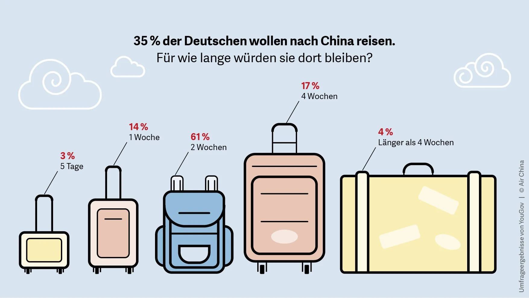 Im Rahmen ihrer Kampagne „Land your Dream“ hat Air China eine großangelegte Umfrage zur Reisedestination China in Deutschland, Frankreich und Großbritannien durchgeführt. Die interessanten und oft auch lustigen Ergebnisse haben wir mit leichten Anflügen von Fernweh aufbereitet – für die Pressekonferenz in Frankfurt am Main und für die Nutzung auf Social Media.